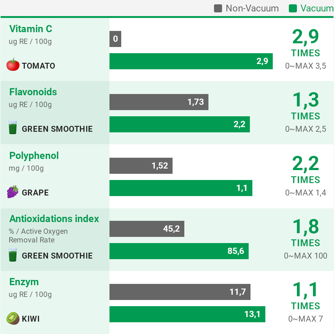 La tecnología de vacío evita la oxidación de los alimentos y proporciona el mayor nivel de vitaminas y nutrientes en comparación con nuestra licuadora centrífuga convencional.