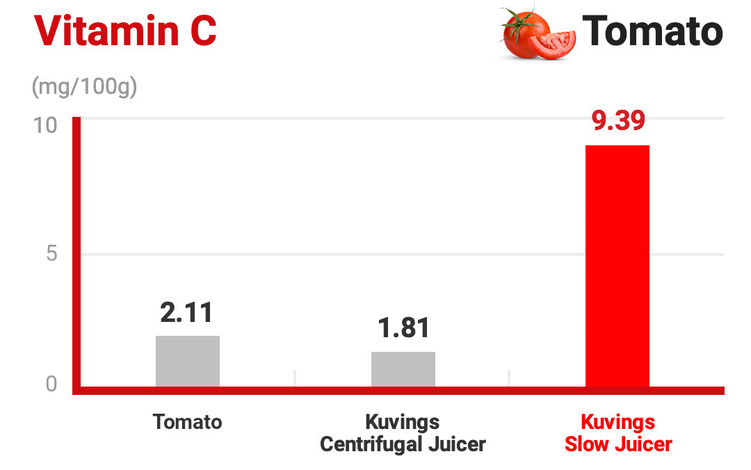 El contenido de vitamina C en el jugo preparado con un exprimidor lento es 5,2 veces mayor que el del jugo de un exprimidor centrífugo. La oxidación es otra causa de los bajos niveles de vitamina C.