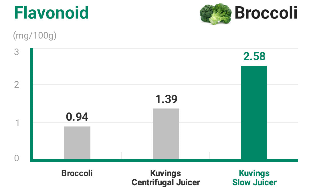Flavonoides: El jugo de un exprimidor lento contiene 1,5 veces más flavonoides que la fruta y el jugo de un exprimidor centrífugo.